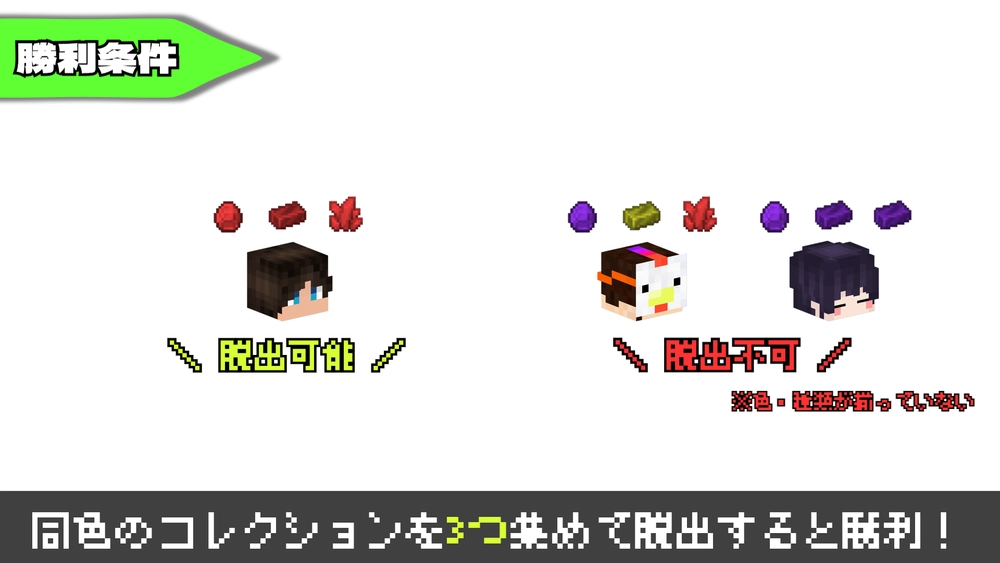 脱出口が光り輝き、同色の3種類のコレクションをそろえたプレイヤーが脱出可能になります。